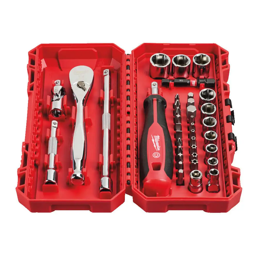 Wszechstronny zestaw narzędziowy Milwaukee składający się z 38 elementów, idealny do pracy w trudno dostępnych miejscach. Wyposażony w grzechotkę 1/4" z mechanizmem o 90 zębach, zapewniającym precyzyjny skok roboczy co 4°, co znacznie ułatwia operowanie w ciasnych przestrzeniach.