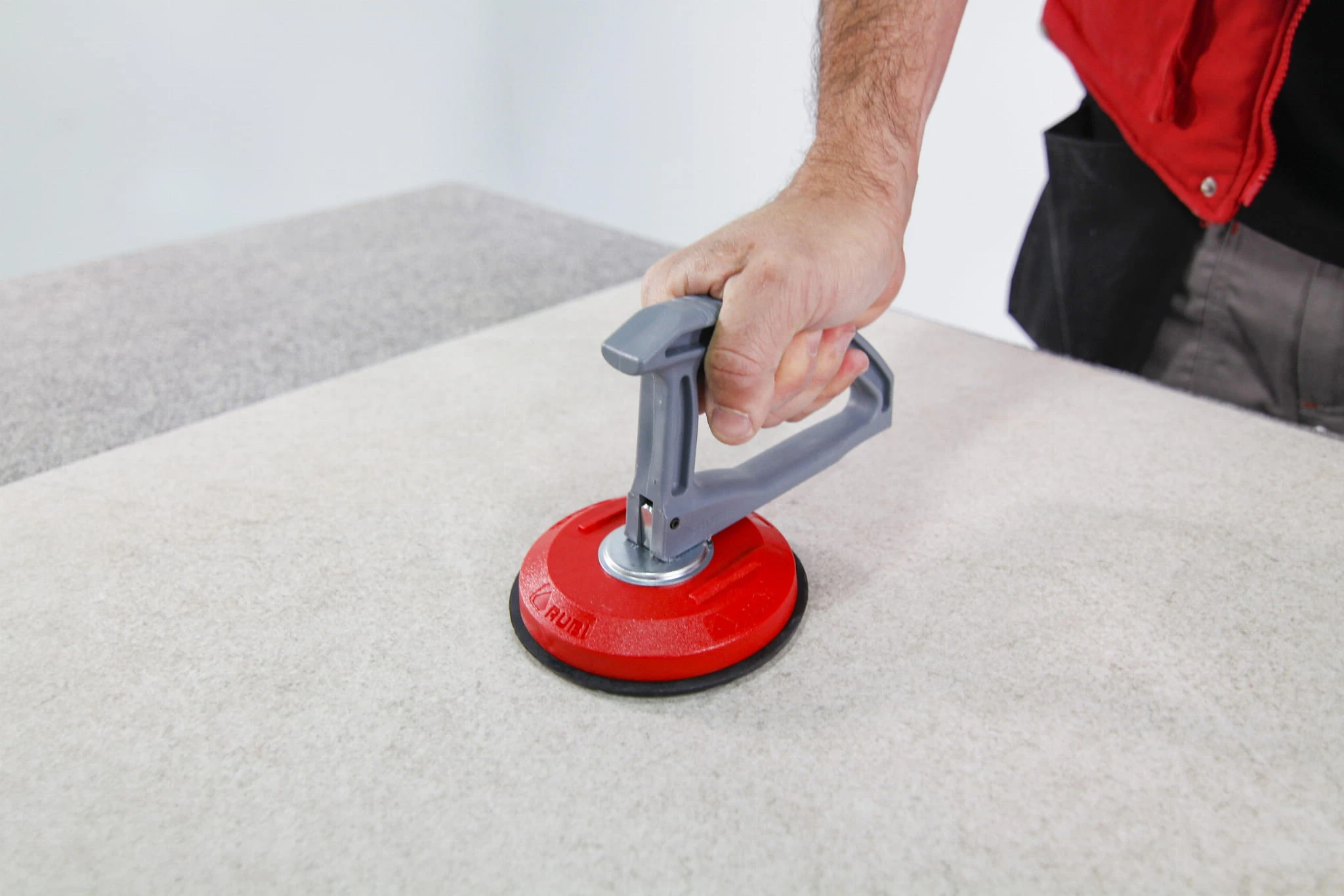 Pojedyncza przyssawka RUBI ma bardzo wytrzymały korpus z technicznego polimeru oraz ergonomiczny uchwyt pozwalający na przyjęcie najlepszej pozycji podczas operowania dużymi płytkami.
