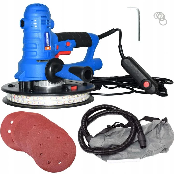 Wysokiej jakości szlifierka bezpyłowa firmy GERMANN model SZTY001 z podświetleniem LED. Urządzenie przeznaczone jest do szlifowania tynków i gładzi gipsowej. Krótka rękojeść i dodatkowa rączka umożliwia precyzyjne szlifowanie. Napęd z silnika jest przenoszony przez przekładnię, bez pośrednictwa zbędnych linek napędowych. Jest to prosta, solidna i zwarta konstrukcja. Szlifierka wyposażona jest w system odprowadzania pyłu przystosowany do pracy z odkurzaczem przemysłowym, na wyposażeniu znajduje się worek zbierający pył oraz wąż umożliwiający podłączenie do odkurzacza. Ponadto system odpylania posiada kontrolę siły ssania, jest to rzadko spotykana cecha w tego tupu urządzeniach.