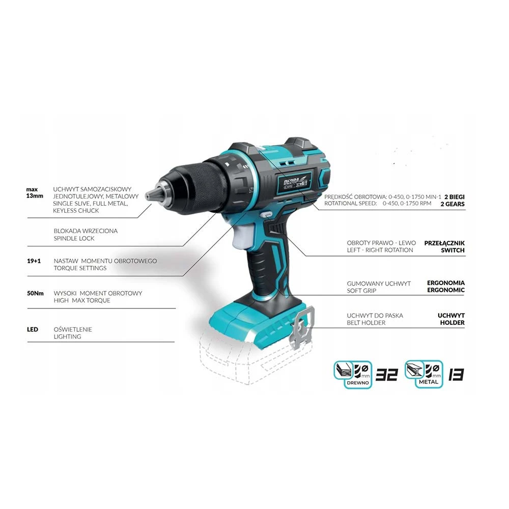 Dodatkowe oświelenie led sprawi, że prezycyjnie wykonamy pracę w niedoświetlonych, trudno dostęnych miejscach. - 13mm uchwyt samozaciskowy, jednotulejowy, zapewnia prosty montaż wszelkiego rodzaju końcówek roboczych tj. wiertła, bity.