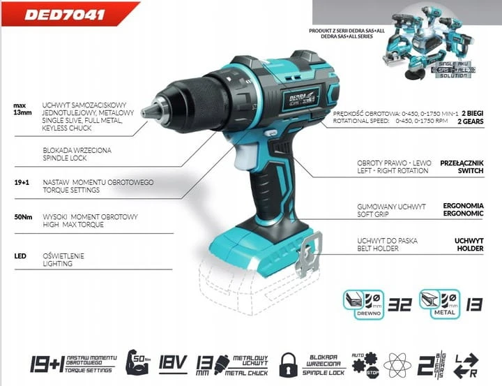 Wkrętarka Dedra DED7041 wyposażona została w dwubiegowy silnik o napięciu zasilania 18V co pozwala uzyskać moment 50 Nm.